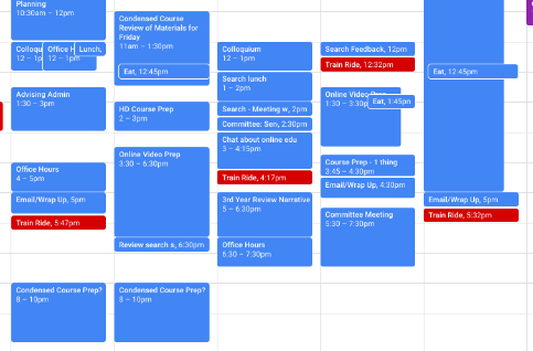 We also keep a paper calendar on the fridge that includes the days I’ll be on campus, what train I need to take and any early morning or late evening meetings.