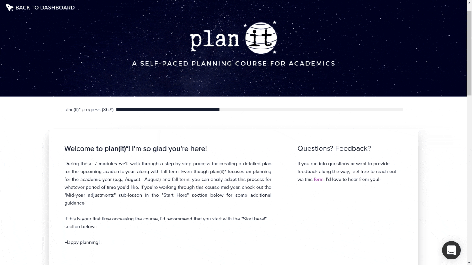 With plan(it)* you’ll walk through a step-by-step process to create a plan for your research, teaching, service, and personal life in a structured and supportive space. And the best part is, you can create your plan from wherever you want, whenever you want, and come back to this process year after year and term after term! Plus, you’ll get access to any updates to the course that happen after you enroll.